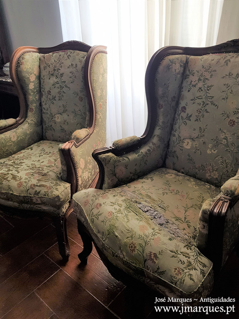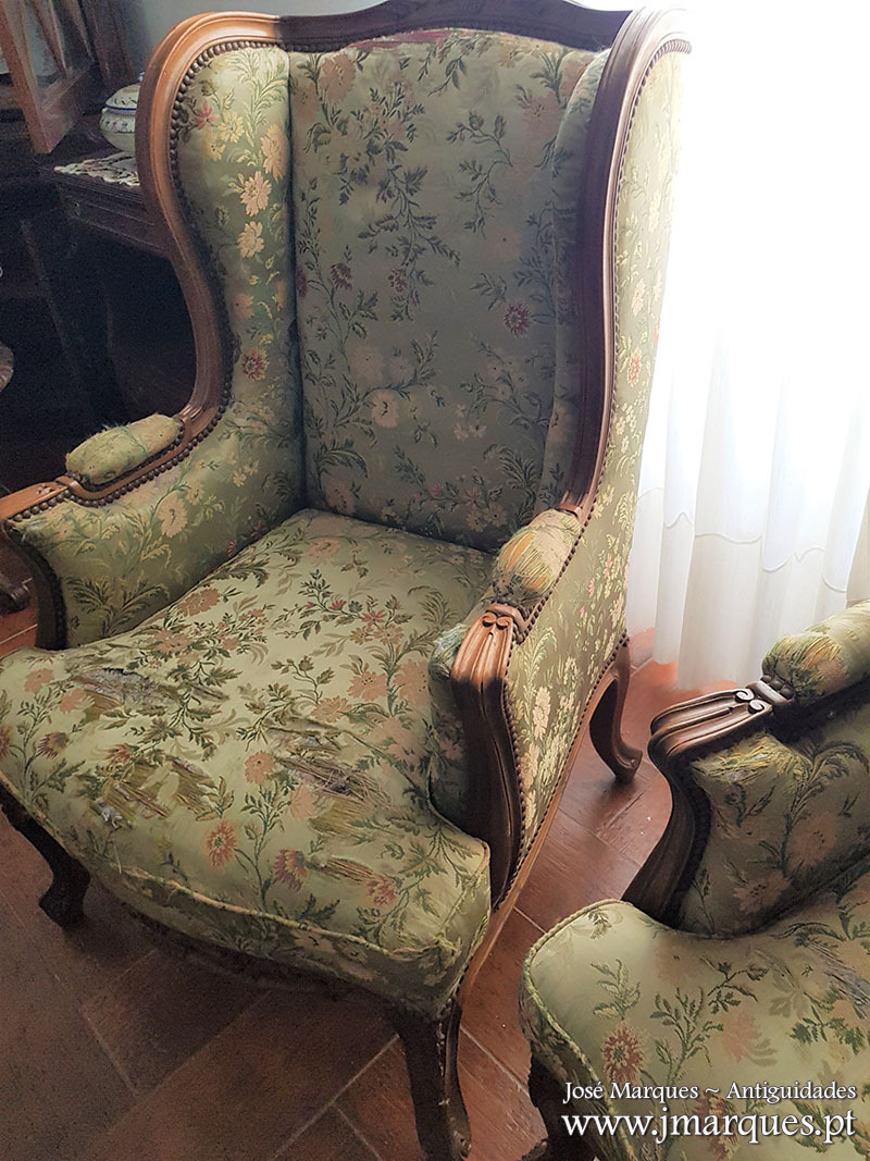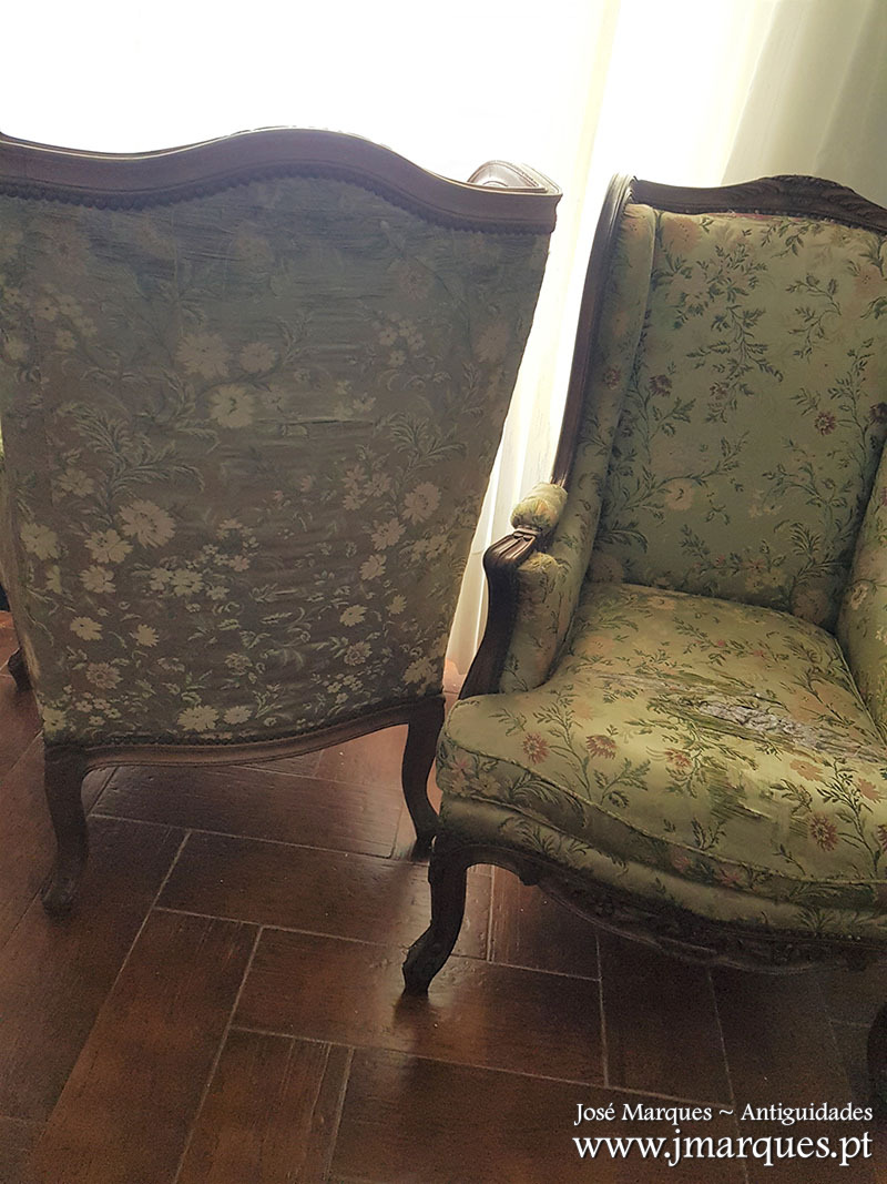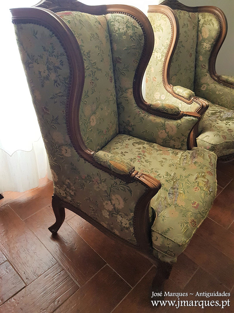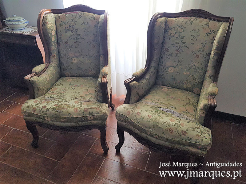 Interessante par de cadeirões de orelhas estilo Luís XV em madeira trabalhada. Precisam ser estufados.