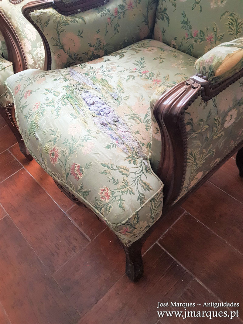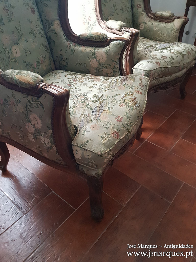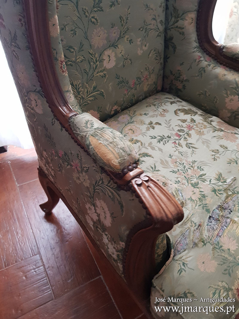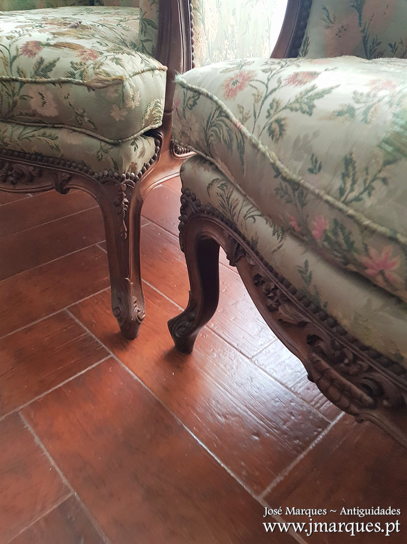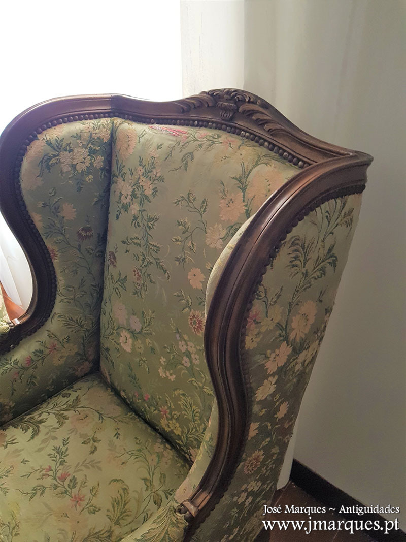 Interessante par de cadeirões de orelhas estilo Luís XV em madeira trabalhada. Precisam ser estufados.