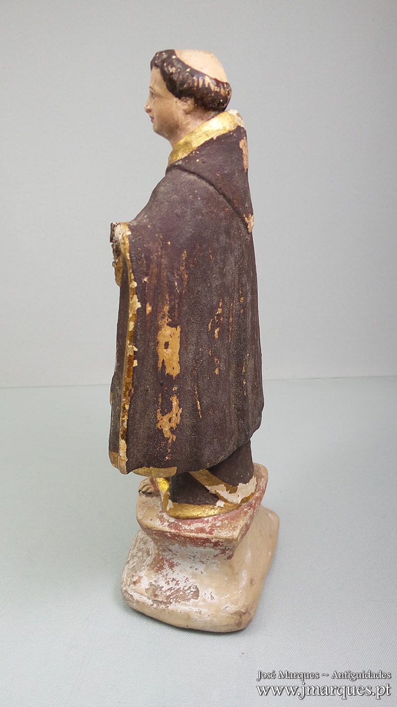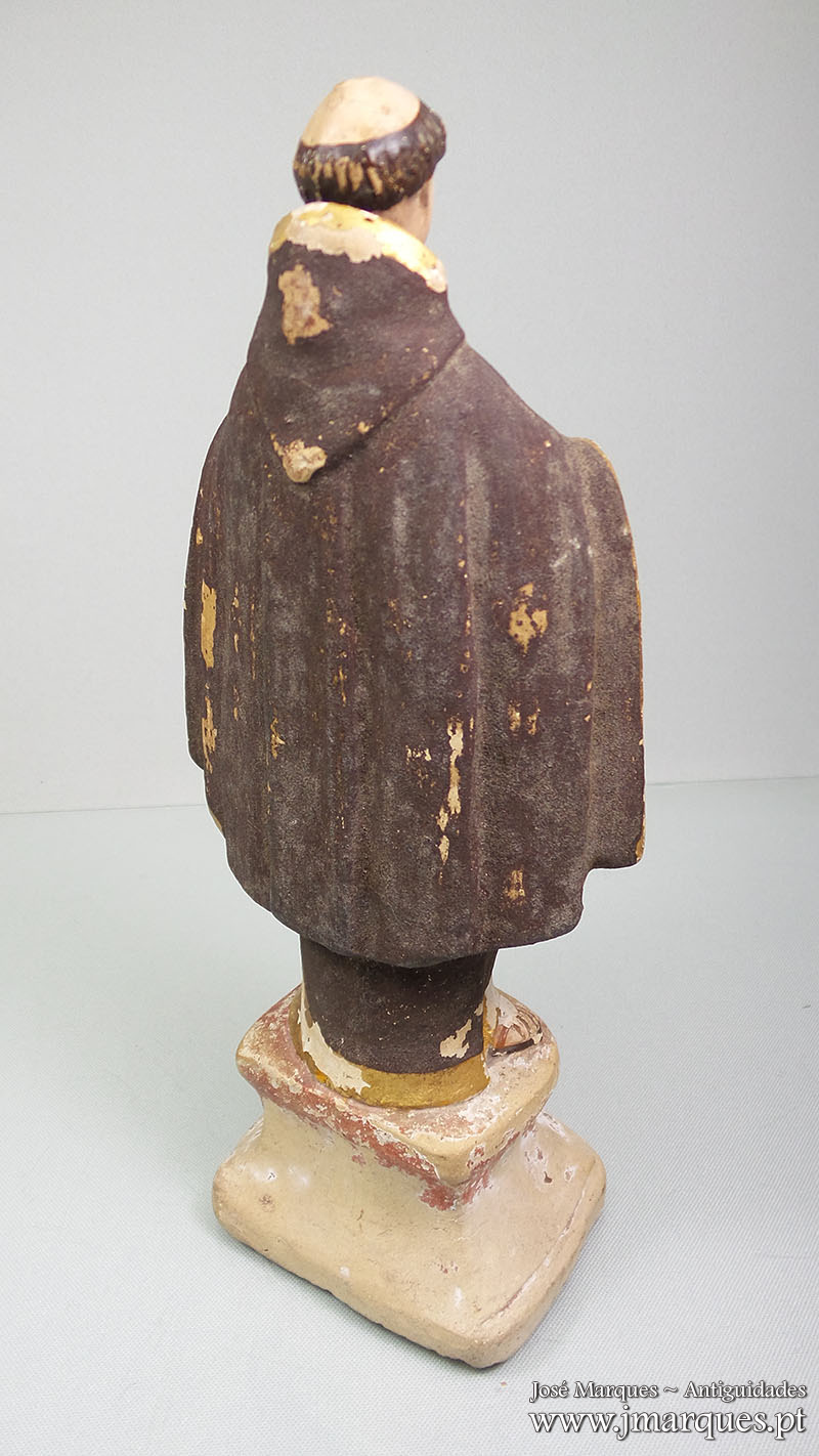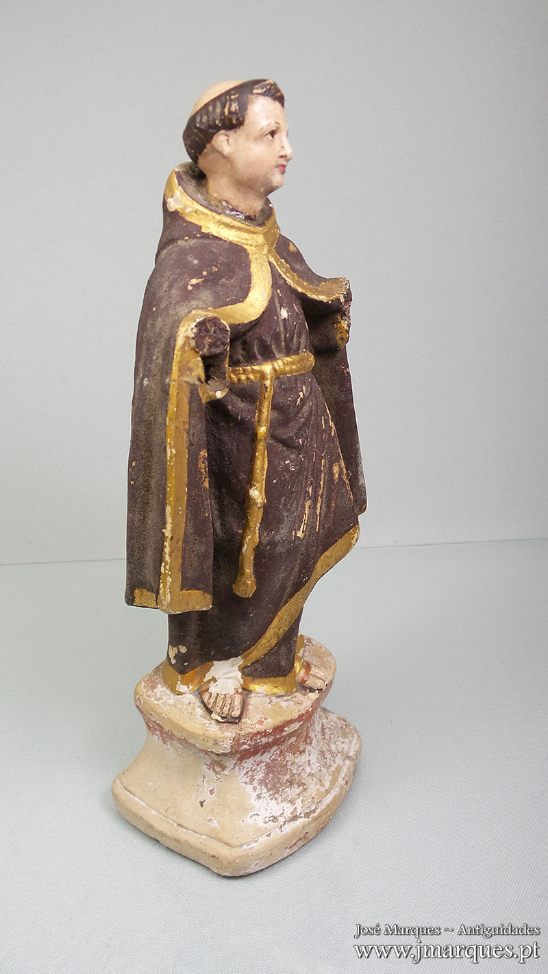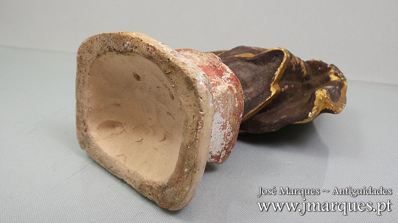 Santo António antigo em terracota sobre peanha. Séc XIX. Peça com defeitos, conforme as fotografias.