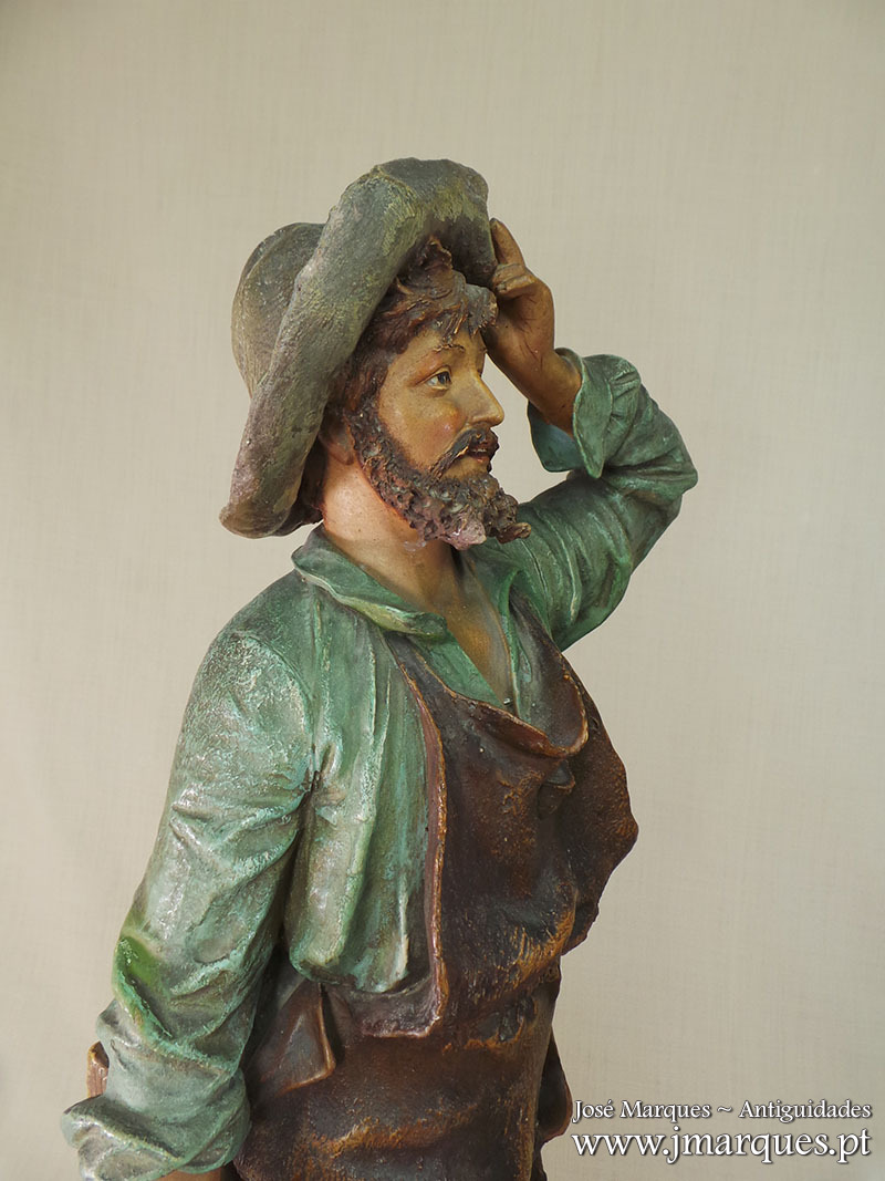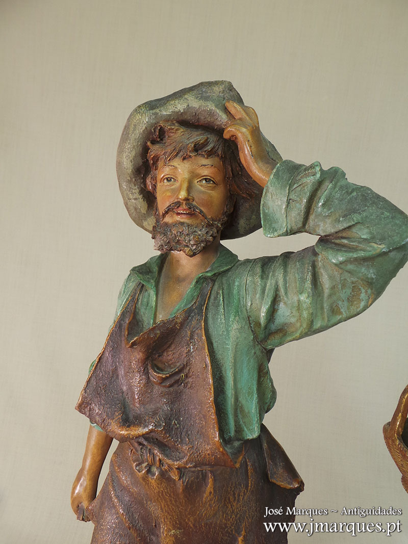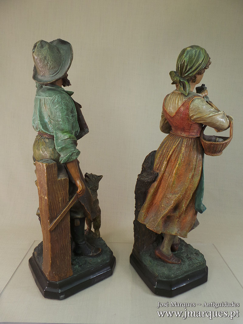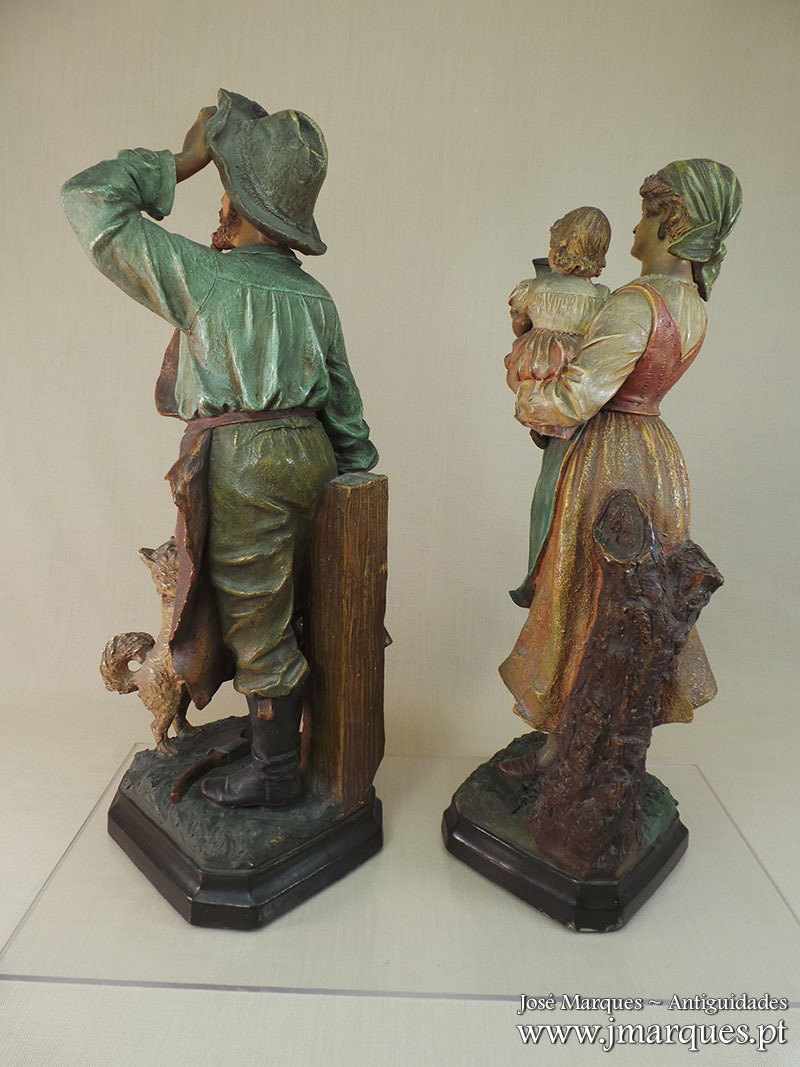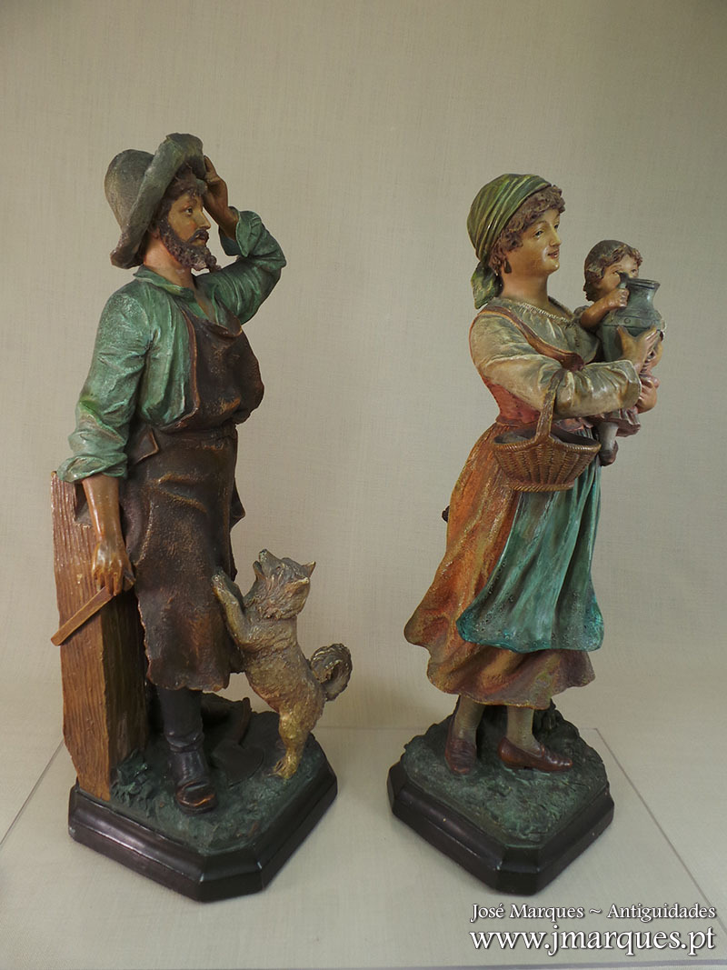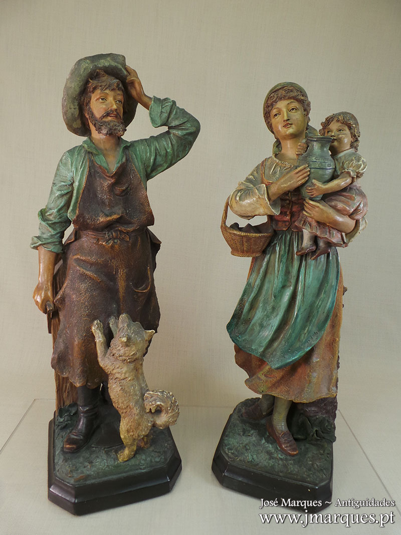 Par de esculturas antigas de camponeses em barro fino, ligeiros defeitos.