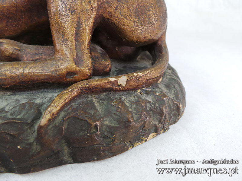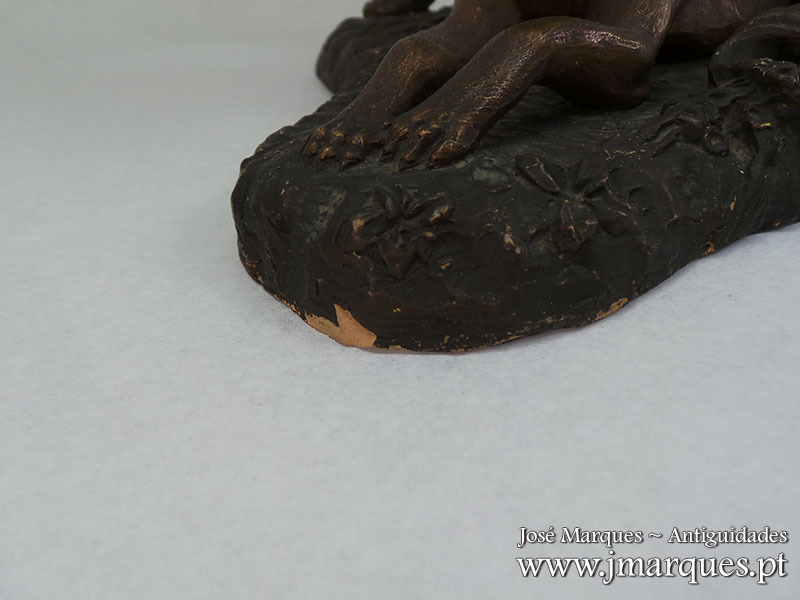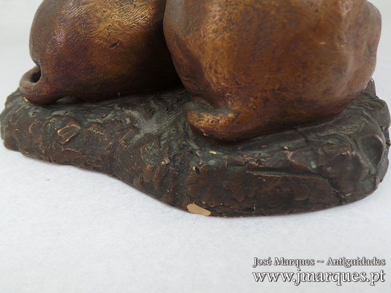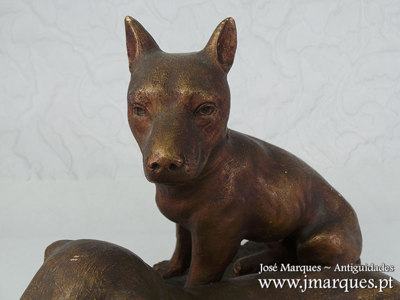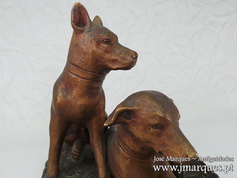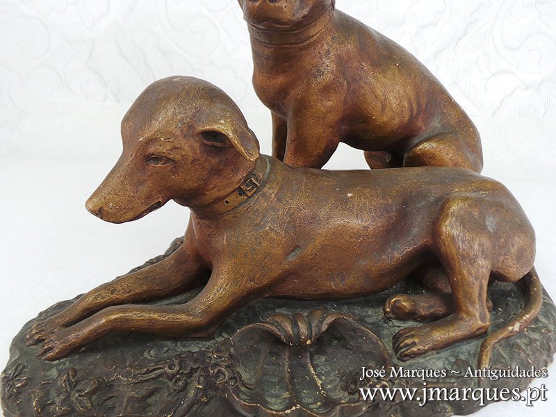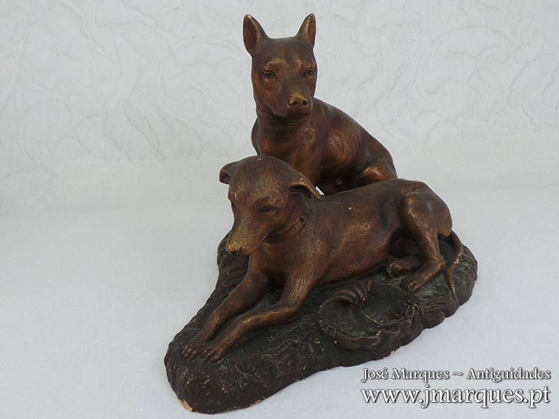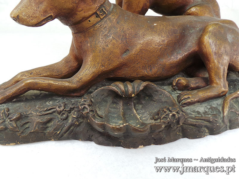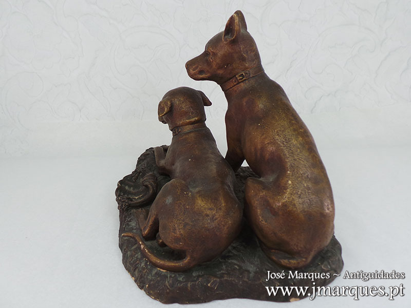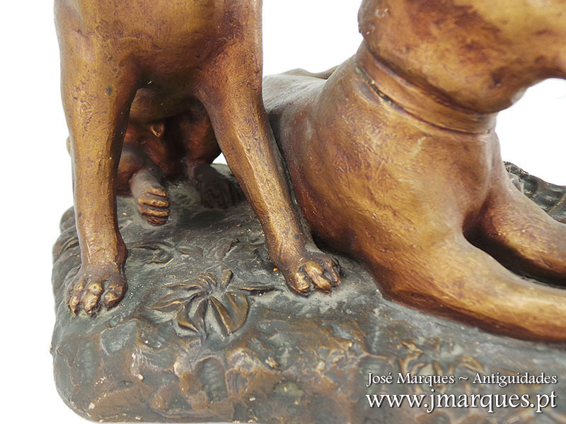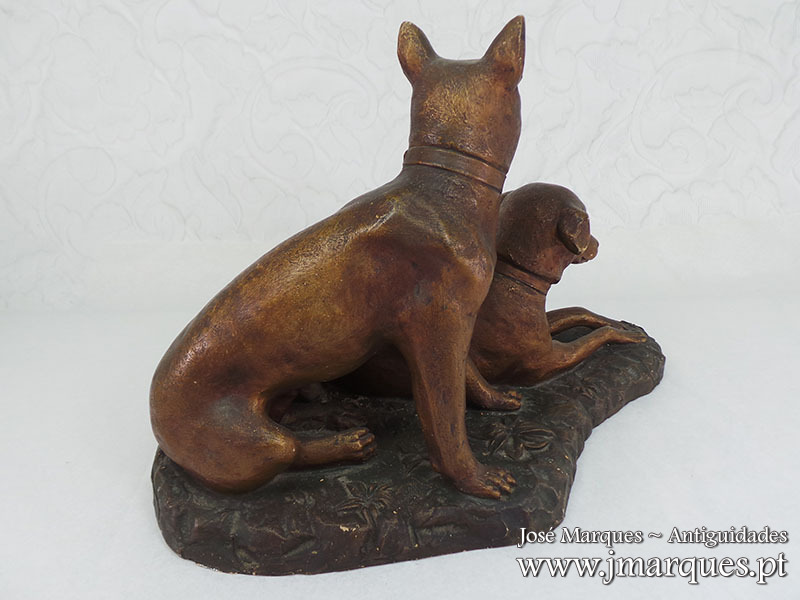 Escultura antiga em terracota com Cães. Marcada: A industrial Decorativa de Coimbra. Peça numerada 490. Condições, mostra traços leves de uso e ligeiros toques, desgaste leve e patina. consistente com a idade.