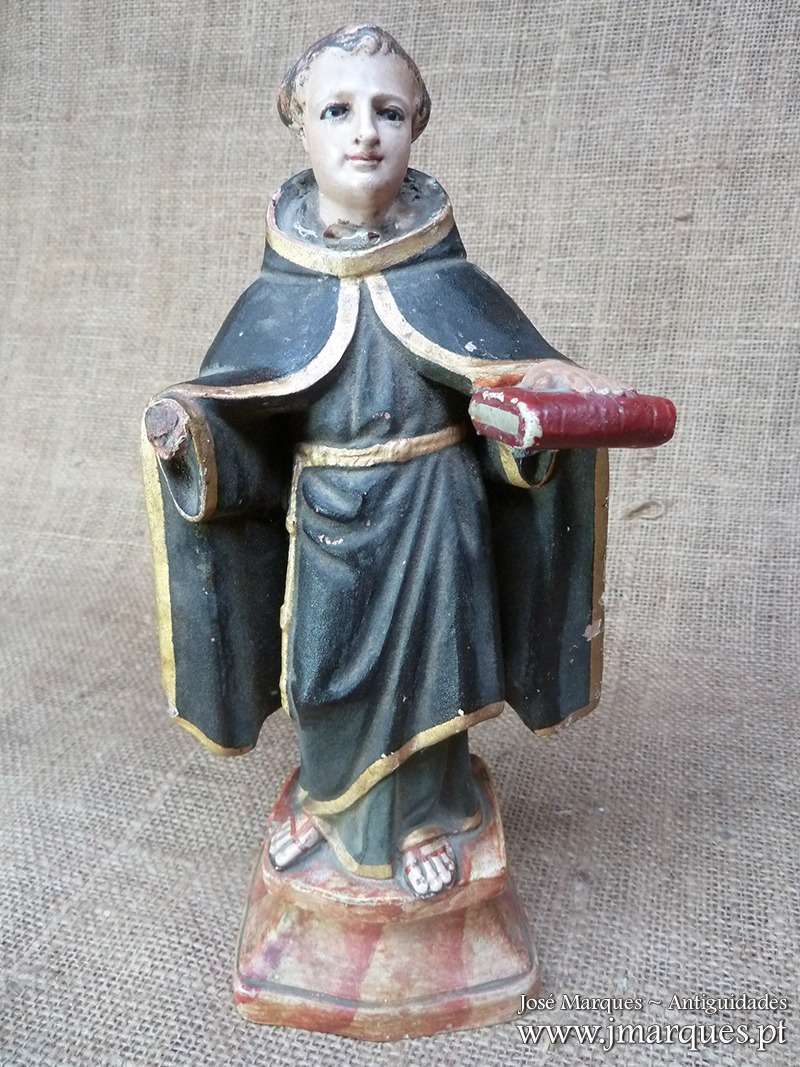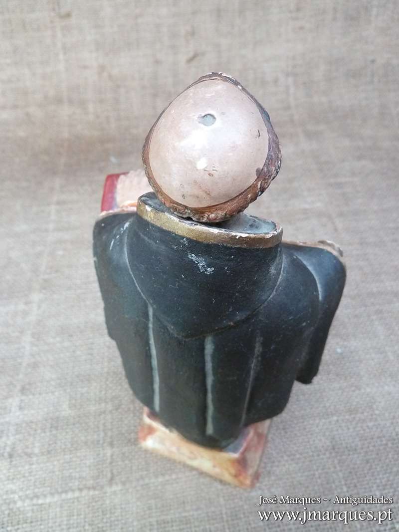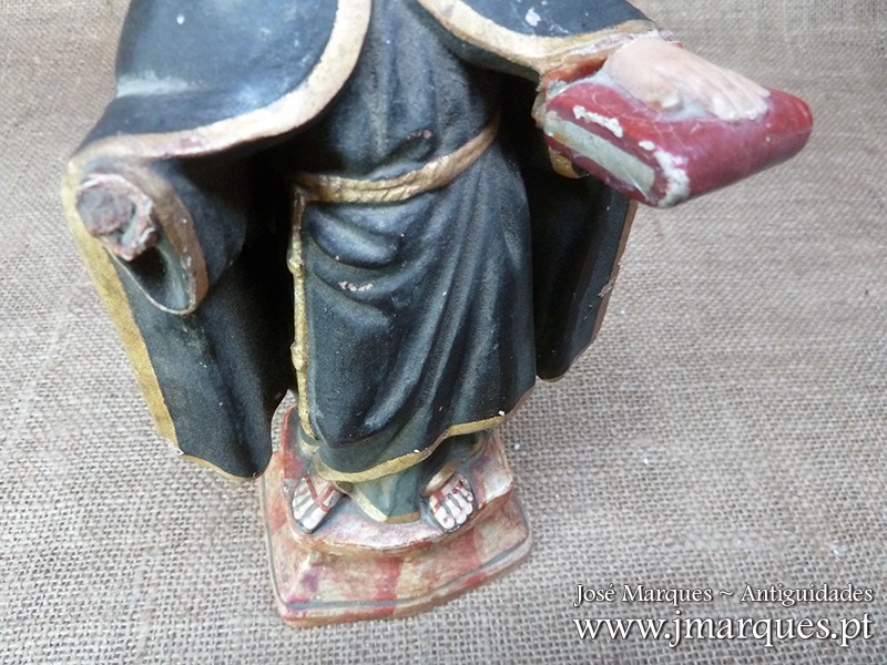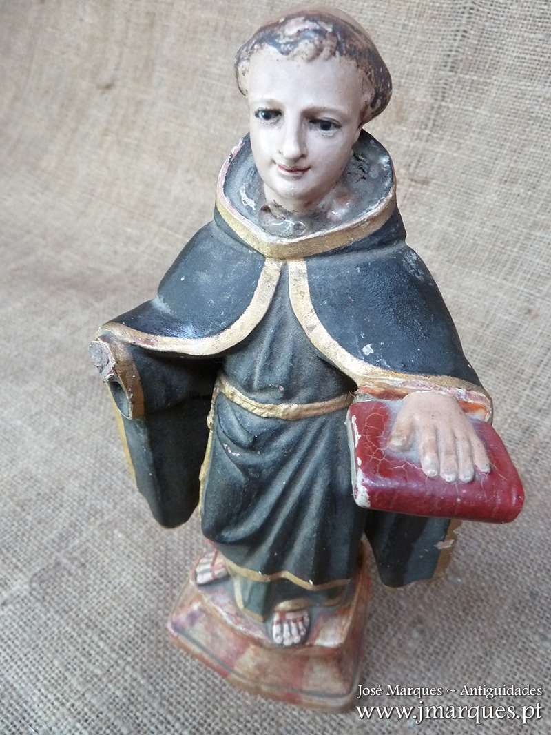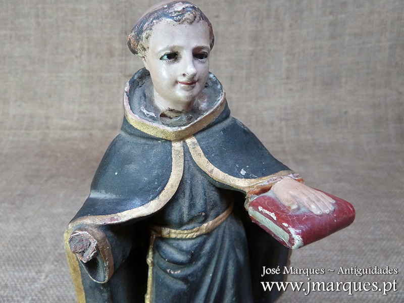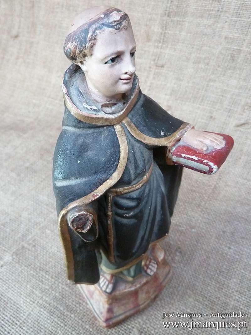Escultura de Santo Antônio antigo em terra cota. Peça com falhas, faltas, colagens e defeitos.