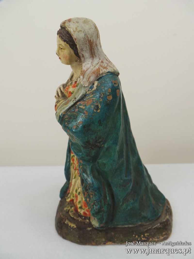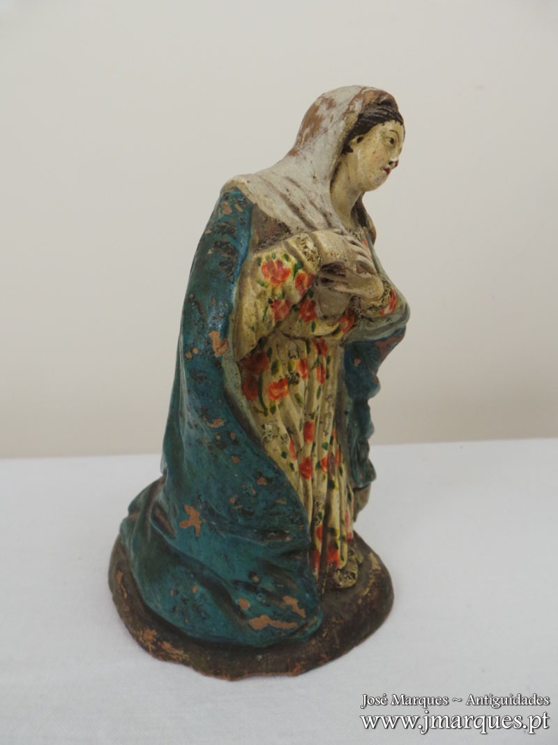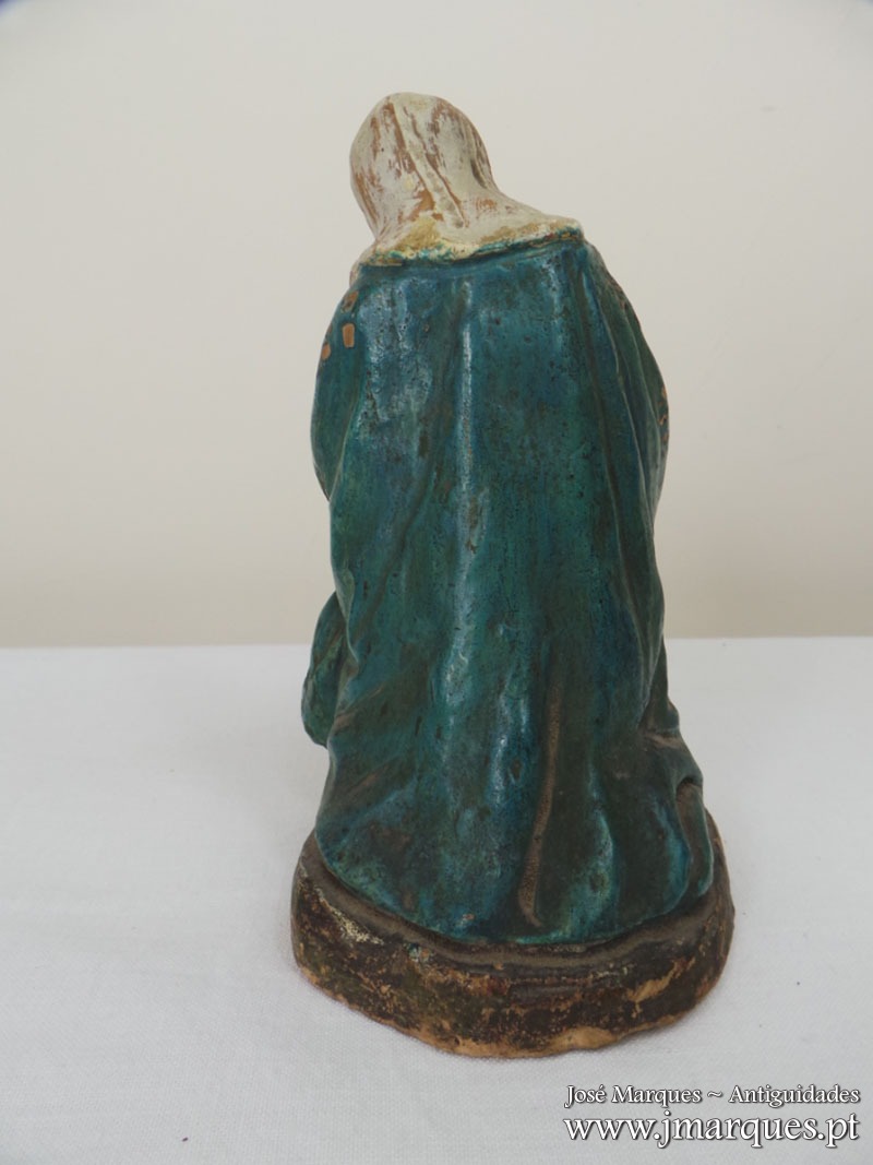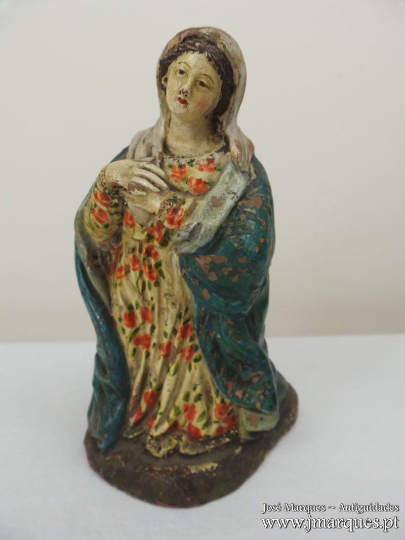 Nossa Senhora escultura antiga em terracota, policromada. Ligeiros defeitos.